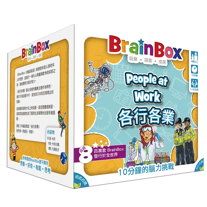 大腦益智盒各行各業向孩童介紹了一系列的有趣的行業,從演員到太空人,從舞者到設計師,從消防員到足球運動員。來探索工作的世界,陪你認識各行各業!來場充滿樂趣的記憶與聯想問答吧!