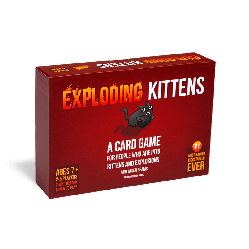Exploding Kittens is a kitty-powered version of Russian Roulette. Players take turns drawing cards until someone draws an exploding kitten and loses the game. The deck is made up of cards that let you avoid exploding by peeking at cards before you draw, forcing your opponent to draw multiple cards, or shuffling the deck.