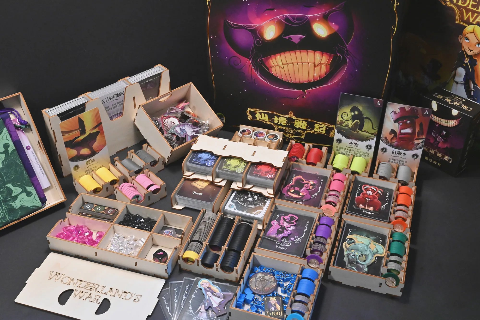 最完整的《仙境戰記》Wonderland’s War 桌遊收納方案。有兩種版本可供選擇,對應【標準版】或【豪華版】遊戲;兩種版本都可一併收入《瘋狂碎片》擴充以及《高級籌碼》升級配件。每位玩家的配件 (角色立牌、擁護者、護盾、圓片、下注卡、籌碼) 都收在獨立小盒中,一人一盒即可拿齊遊戲所需的配件。